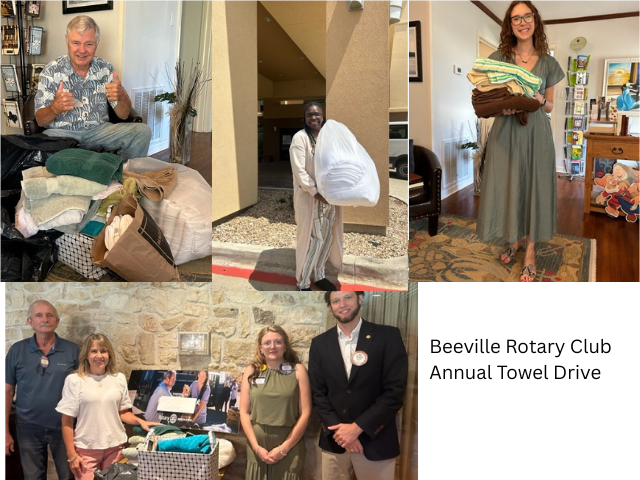 The Beeville Rotary Club conducted its second annual towel drive collection under the direction of the club's service committee. Members of the Beeville Rotary Club, as well as friends of Rotary, collected more than 100 towels to support the local Methodist Church in providing free access to shower facilities for the homeless in the Beeville community.