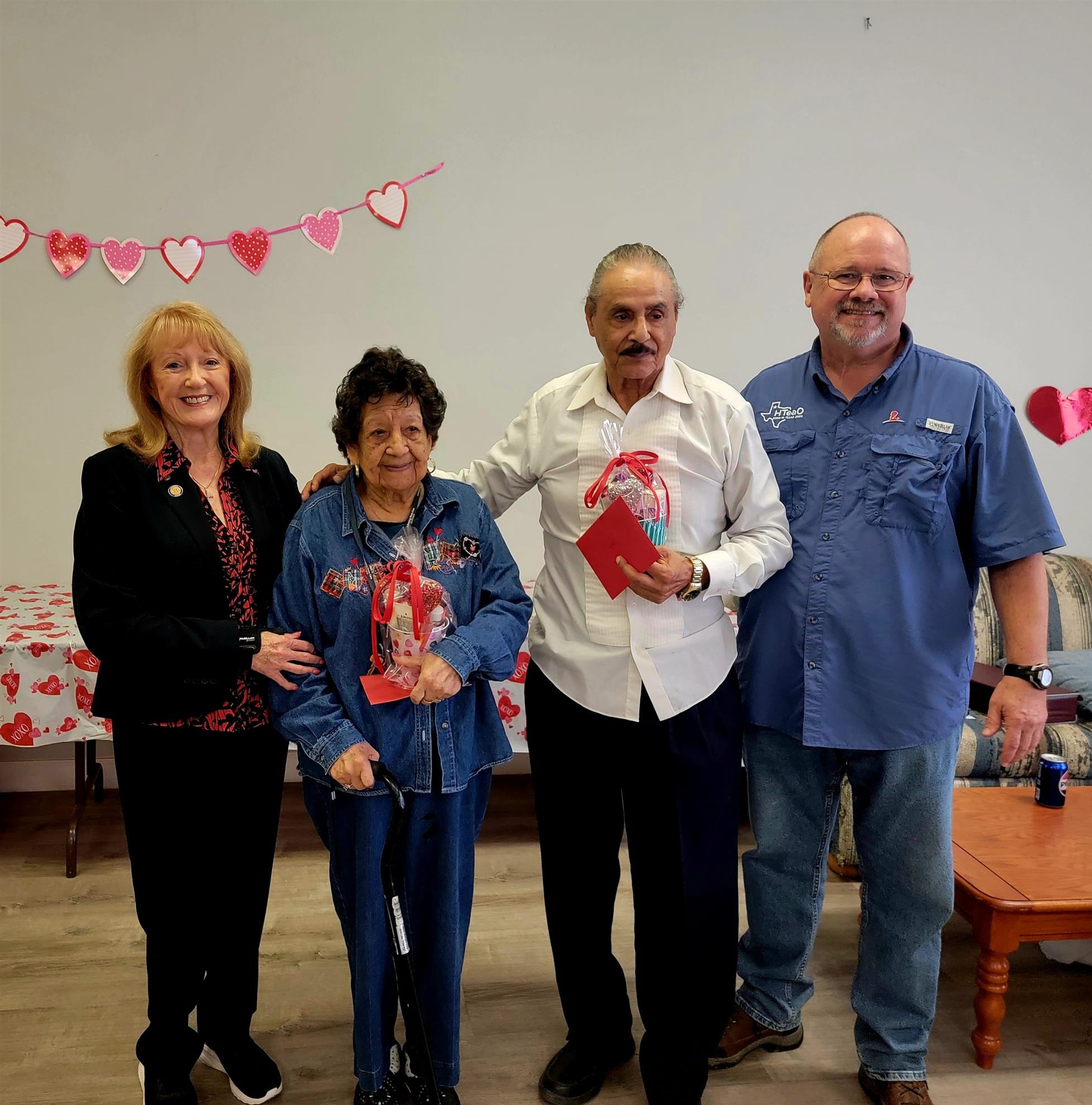 Beto is our resident DJ and always provides music for our festivities. Julia is a spry 100 and is always seen having a wonderful time. These two our the 2026 Valentine King and Queen. Also pictured is our very own Assistant Governor Gloria and President Elect Don.