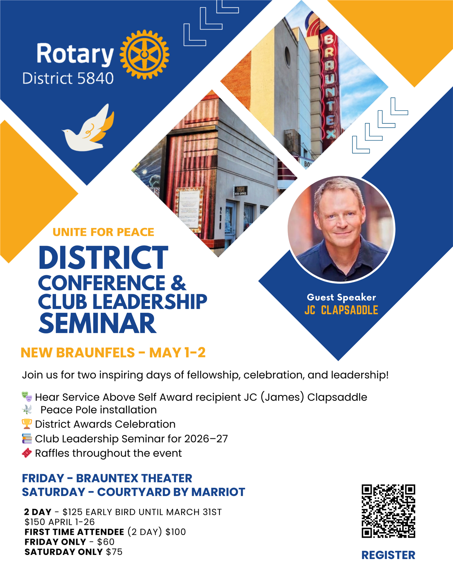 Join us in New Braunfels for the Rotary District 5840 District Conference & Club Leader Training on May 1–2 — and be sure to lock in early bird pricing before rates increase!