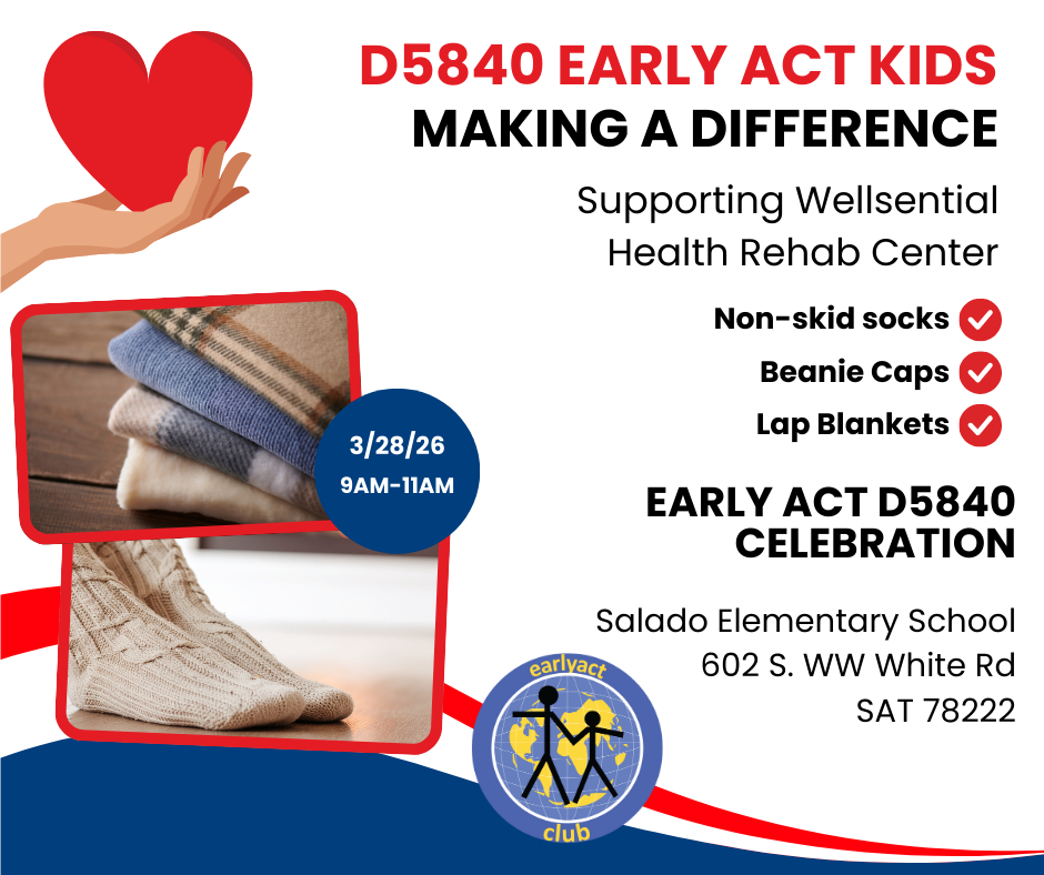 Mark your calendars for Saturday, March 28th for the EARLY ACT DISTRICT 5840 CELEBRATION at the Salado Elementary School! The kiddos need our support!! They are collecting donations of beanie caps, lap blankets and non-skid socks for the Wellsential Health Rehab Center. Please share this list with your club as they need our help!