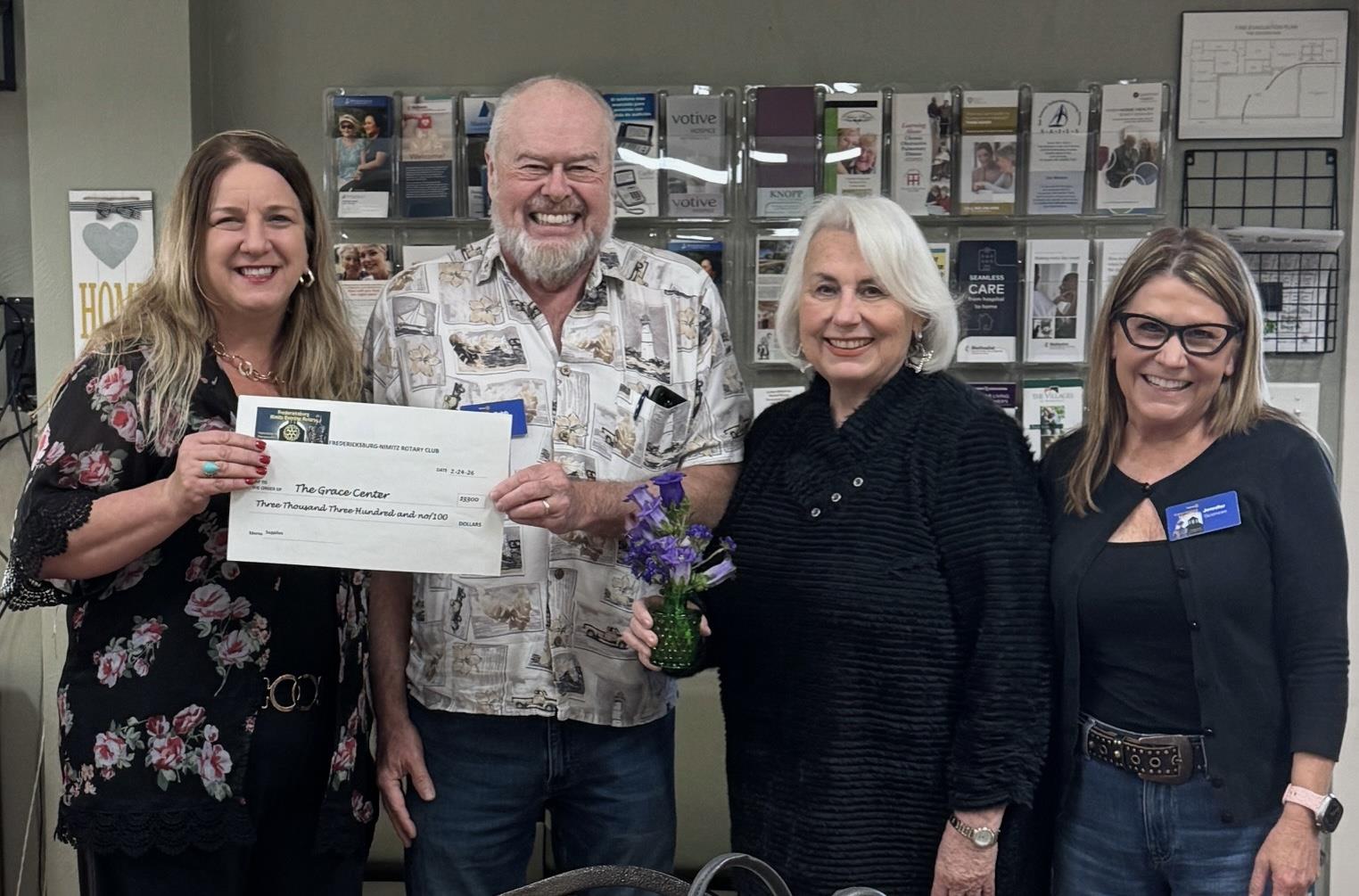 Fredericksburg-Nimitz Rotary Foundation Chair Ralph Bowen presents a check for $3300 to The Grace Center Executive Director, Hattie Heiner. Funds were raised at Texas Heritage Vineyard’s quarterly Bingo and Vino for a Cause event.