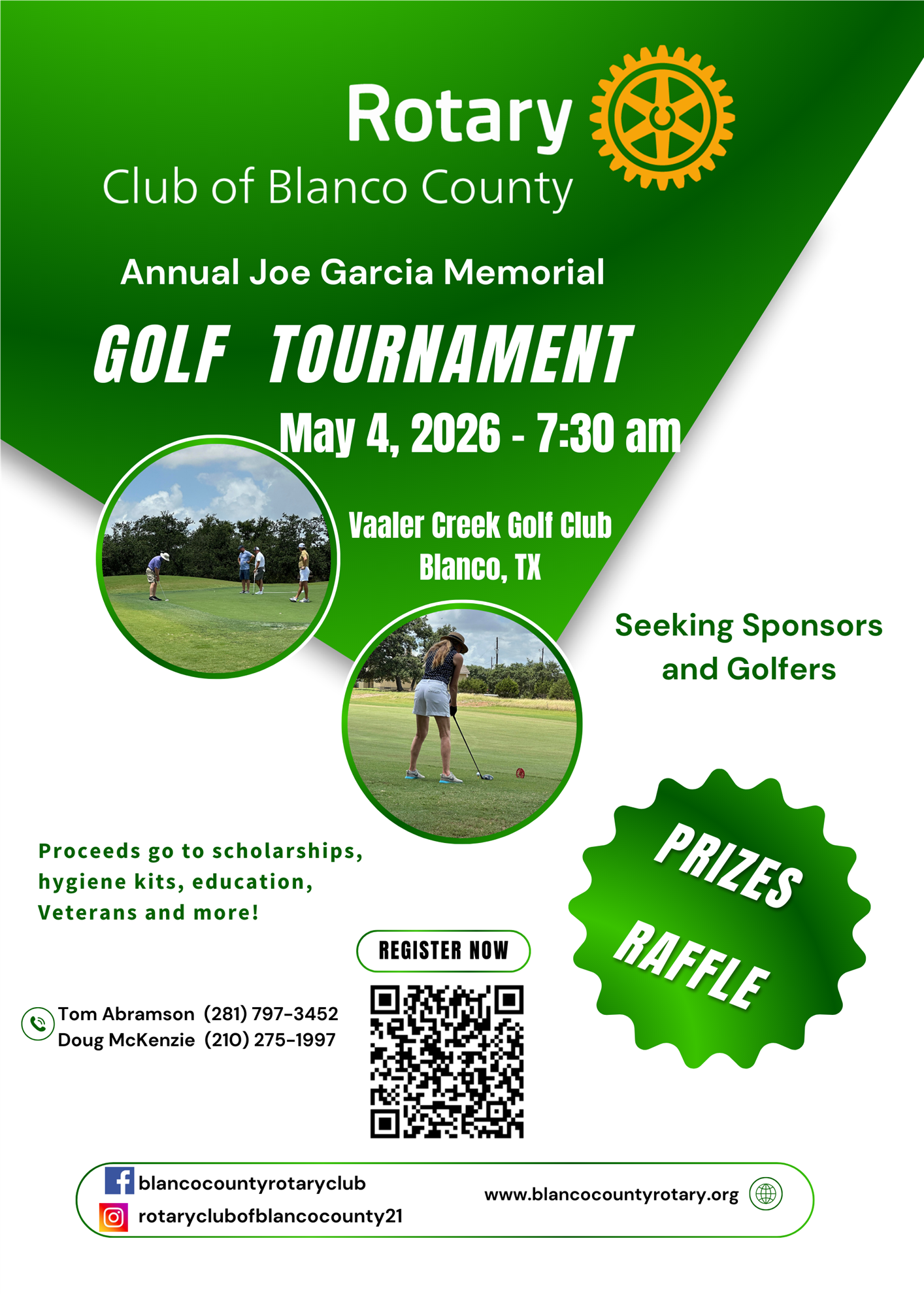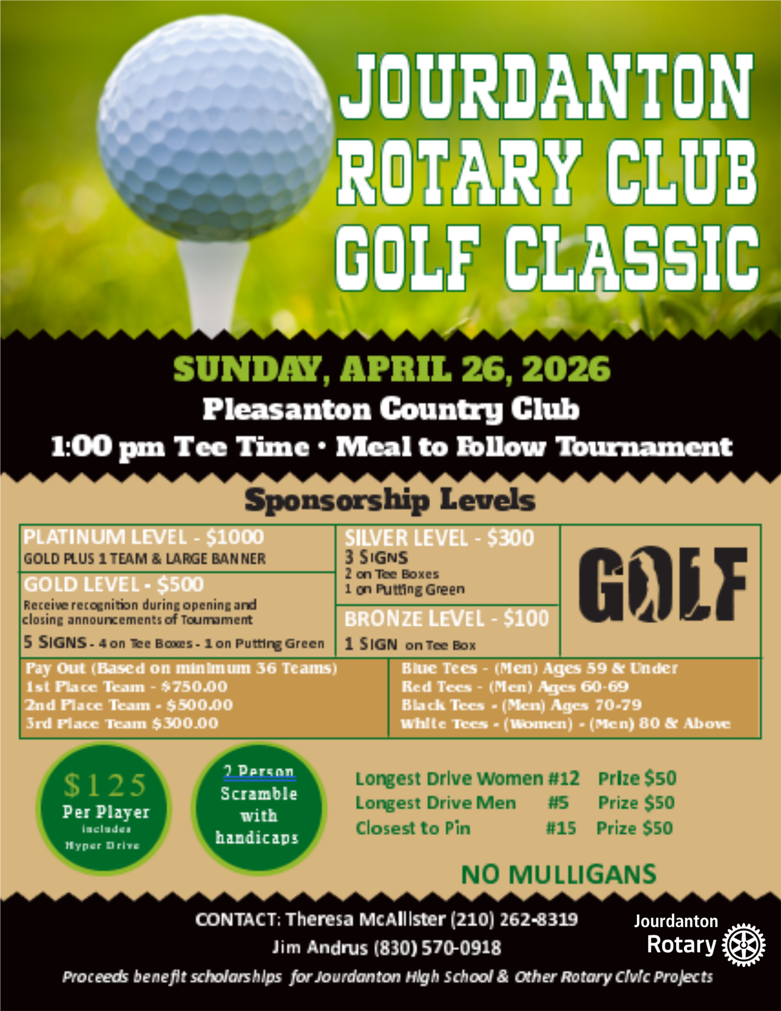 Come join us on Sunday, April 26th at the Pleasanton Country Club for the Jourdanton Rotary Club Golf Classic! Contact Theresa McAllister (210) 262-8319 or Jim Andrus (830) 570-0918 to sign up or for sponsorship opportunities!