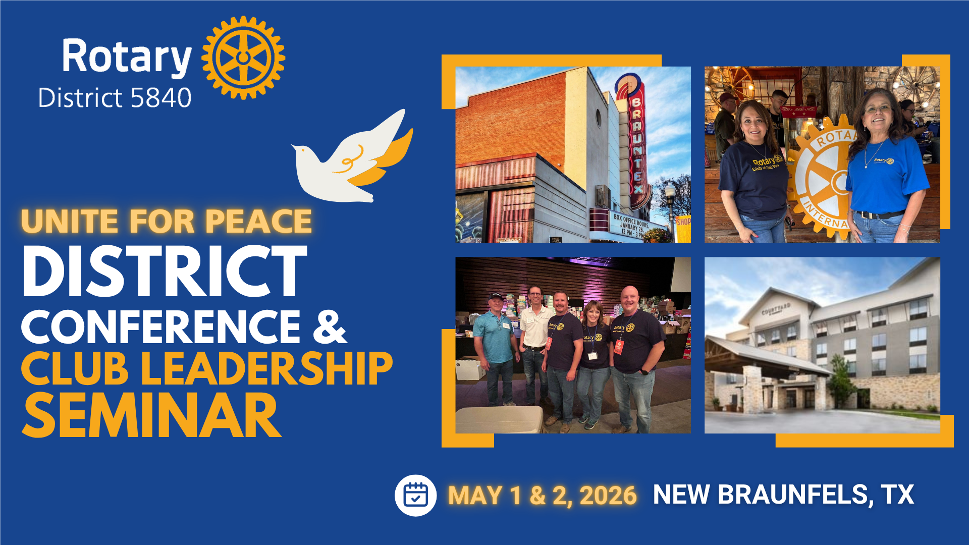 Get ready for an inspiring Rotary weekend! Join Rotarians from across District 5840 in New Braunfels on May 1–2 for the District Conference and Club Leader Training.