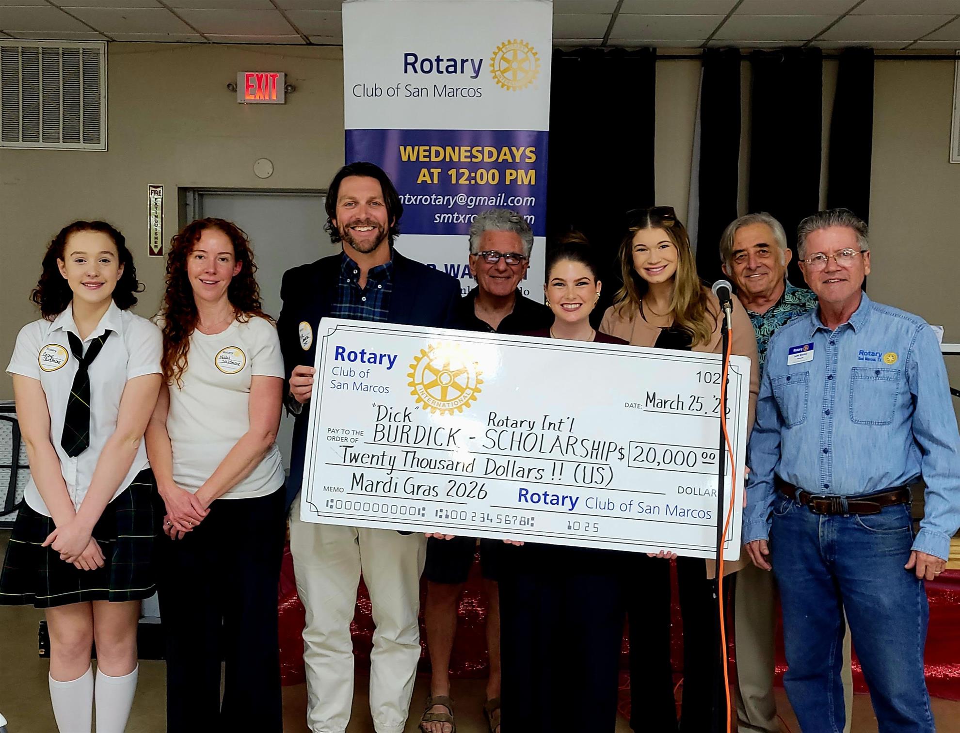 The Rotary Club of San Marcos presented a $20,000 check to the McCoy College of Business at Texas State University that helped endow the “Dick Burdick - Rotary International Scholarship” to benefit students committed to studying international business. The presentation was made on March 25 at the Rotary Club meeting.