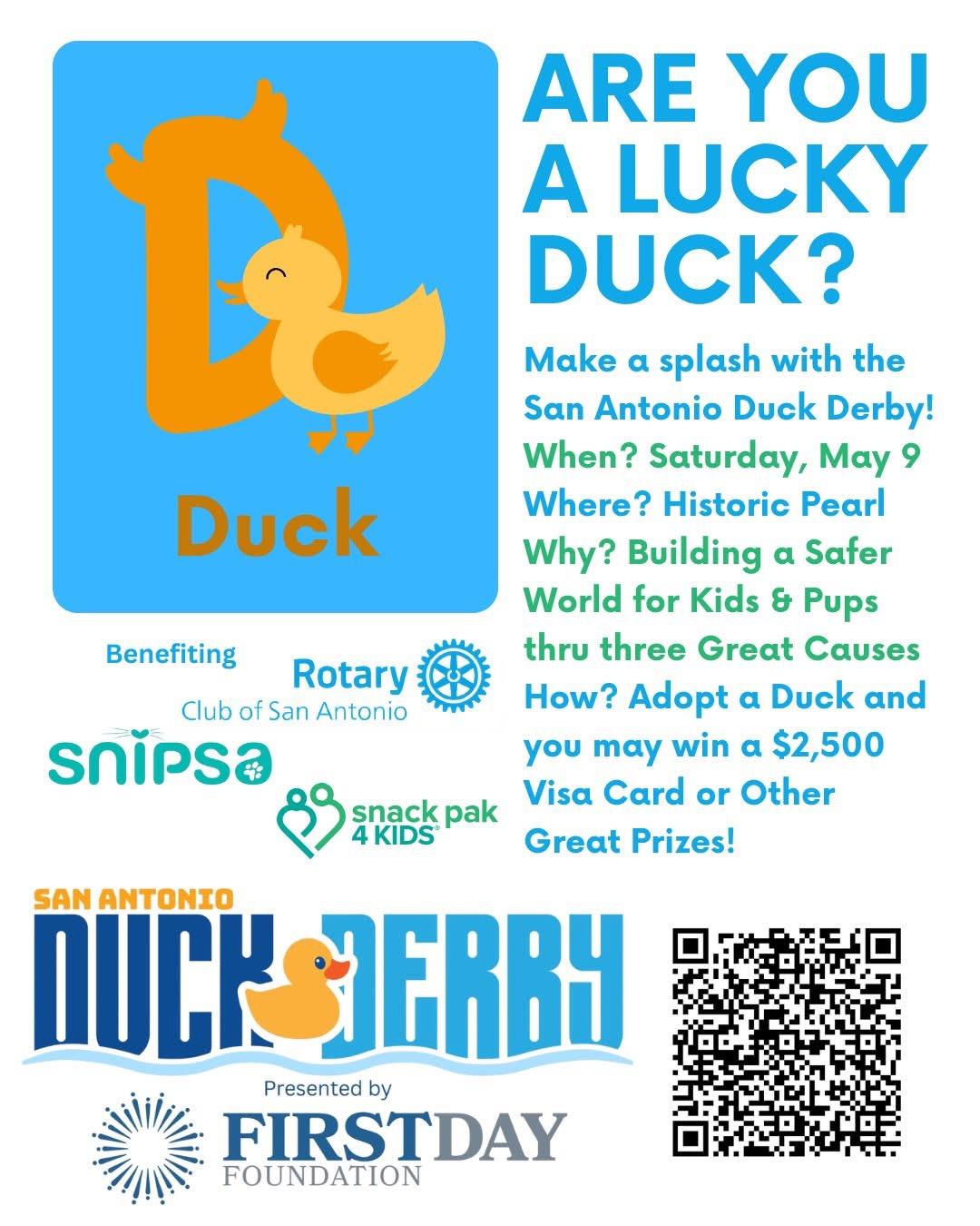 On Saturday, May 9, 2026, the Rotary Club of San Antonio will host the inaugural San Antonio Duck Derby right at the Historic Pearl along the San Antonio River, bringing thousands of rubber ducks, families, and community supporters together for a one-of-a-kind event benefiting three deserving local nonprofits: Snack Pak 4 Kids San Antonio, SNIPSA and Rotary Club of San Antonio’s Kingdom for Kids.