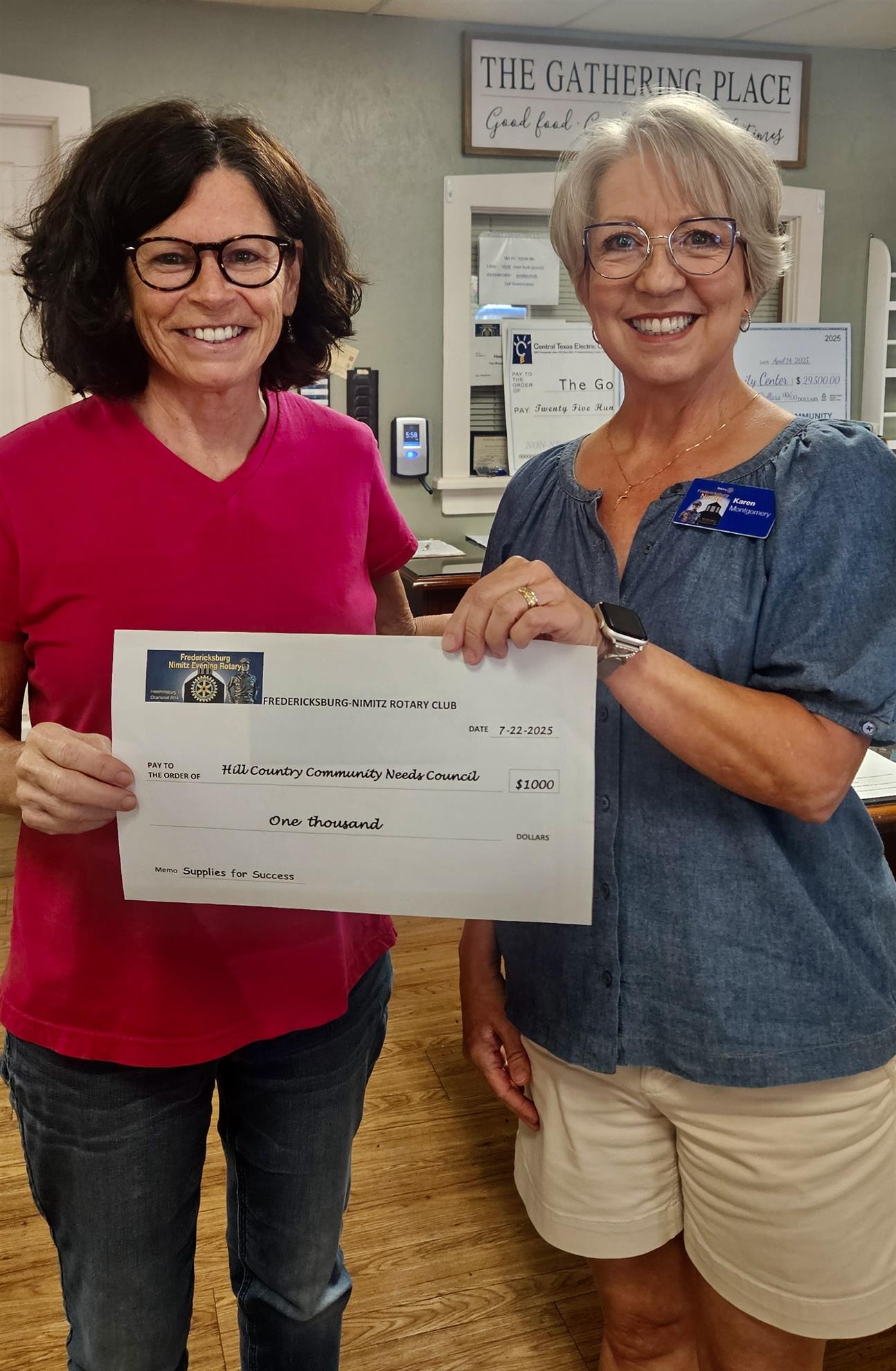 Donation for School Supplies![]() Event Committee Chairman Karen Montgomery presents a check for $1,000 to Cindy Heifner with the Hill Country Needs Council for the Supplies for Success campaign.