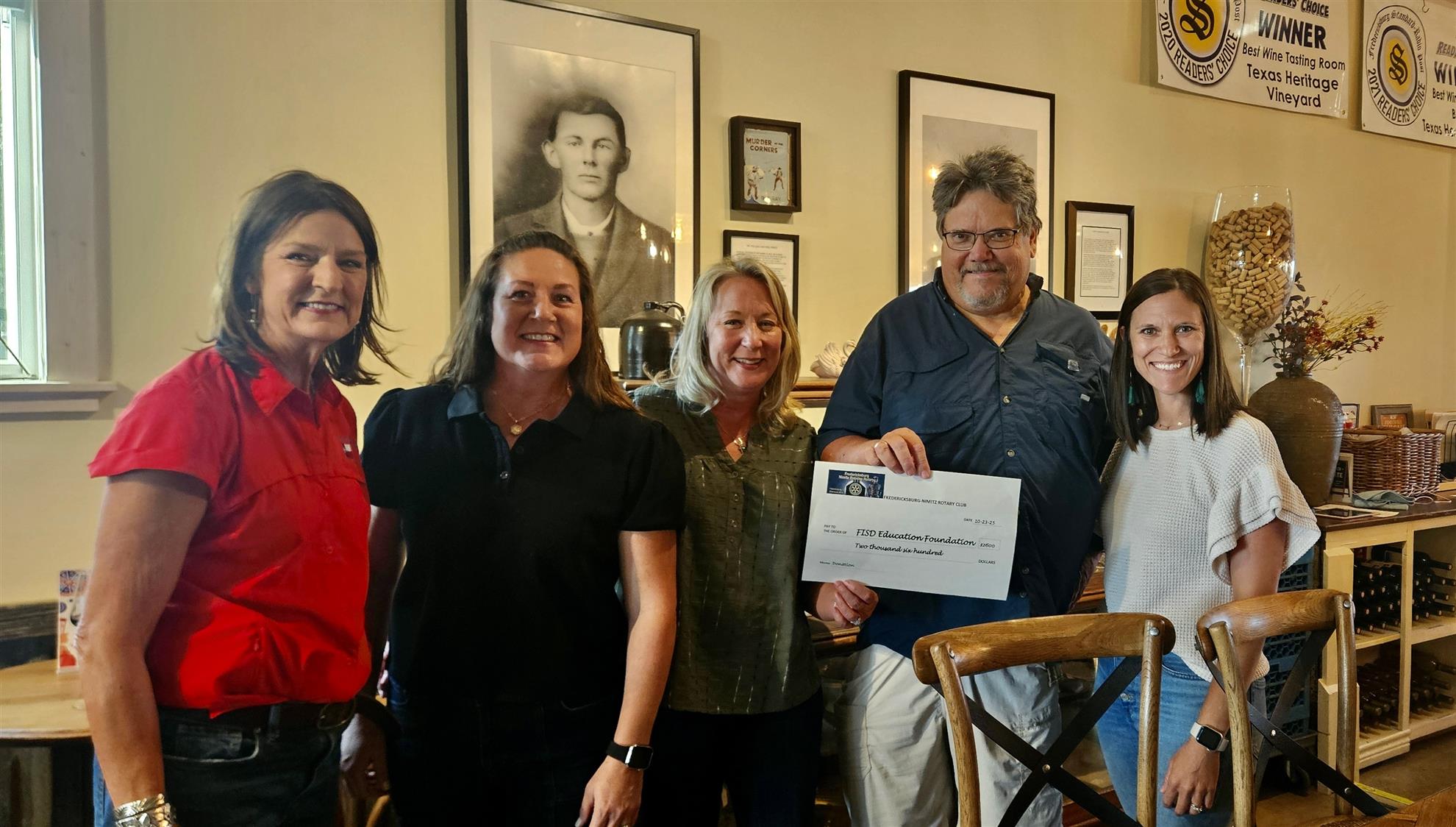 Fundraiser for the Fredericksburg Education Foundation![]() Fredericksburg Nimitz Rotary presents a check for $2,600 to members of the Fredericksburg Education Foundation. The funds were raised at a previous Vino & Bingo fundraiser held by Texas Heritage Vineyards. Proceeds from the sale of bingo cards are donated by Texas Heritage, and the Nimitz Rotary provides a meal by donation and raffles gift baskets.
