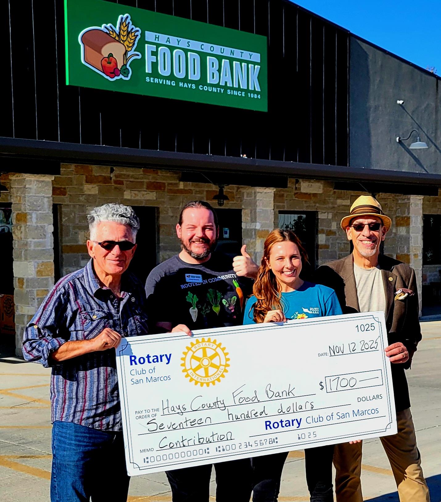 San Marcos Donates to Hays Food Bank![]() Rotary co-presidents Kevin Katz and Sammy Falletta present a $1,700 check to the Hays Food Bank staff on November 12. Additional cash donations occurred later, and Rotary also delivered more than 400 pounds of nonperishable food in October to the Food Bank.