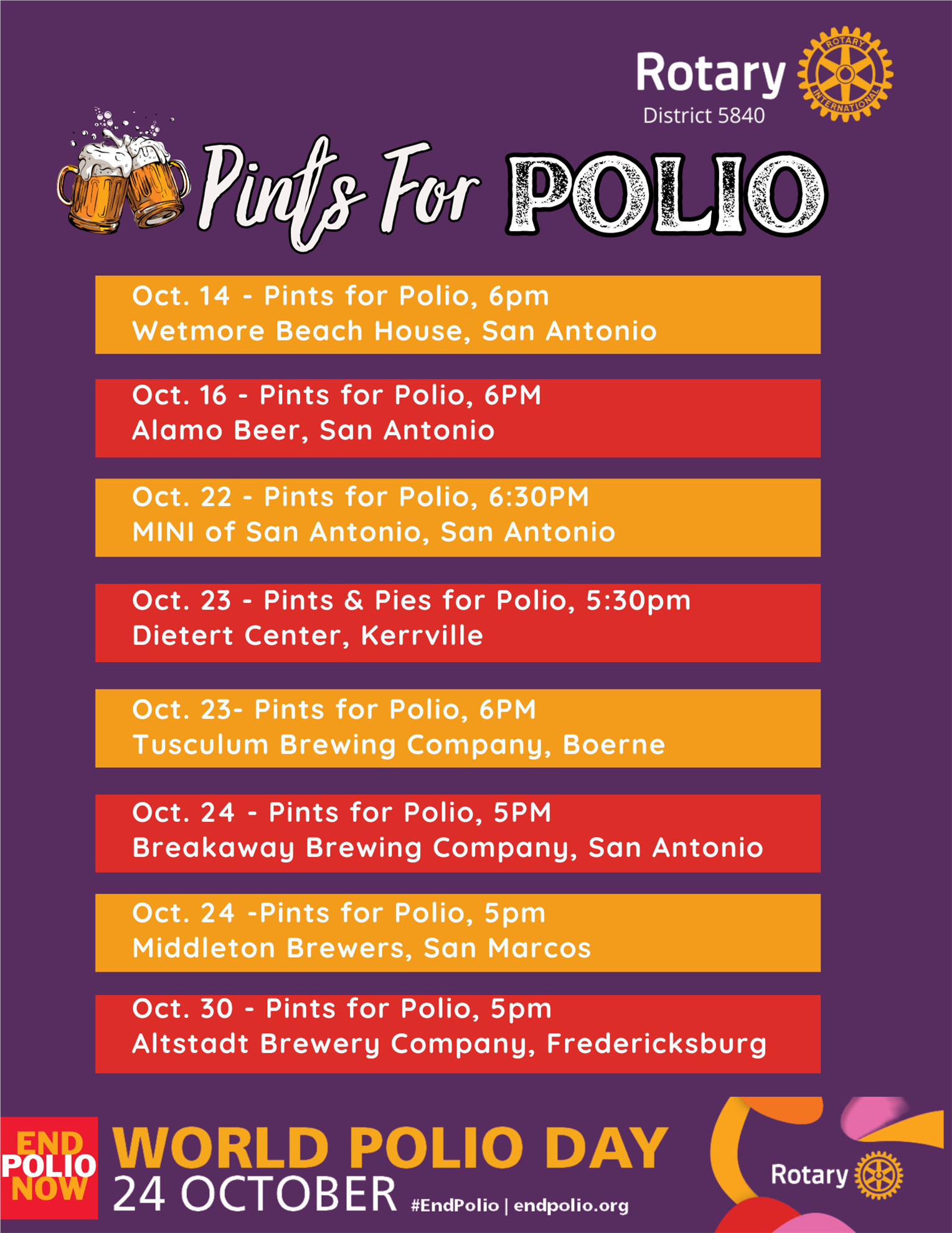 Raise a Pint to End Polio![]() October is here, and with it comes World Polio Day on October 24th—a time for Rotarians and friends to celebrate the incredible progress we’ve made in the fight to end polio and to continue raising awareness and funds for this important cause.