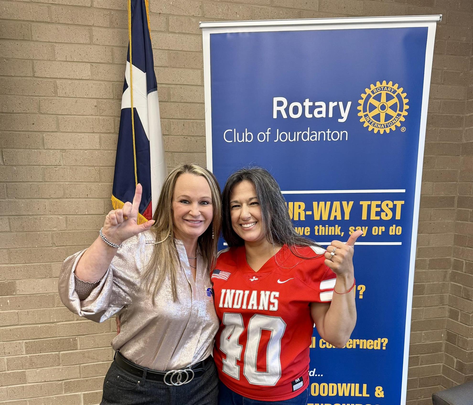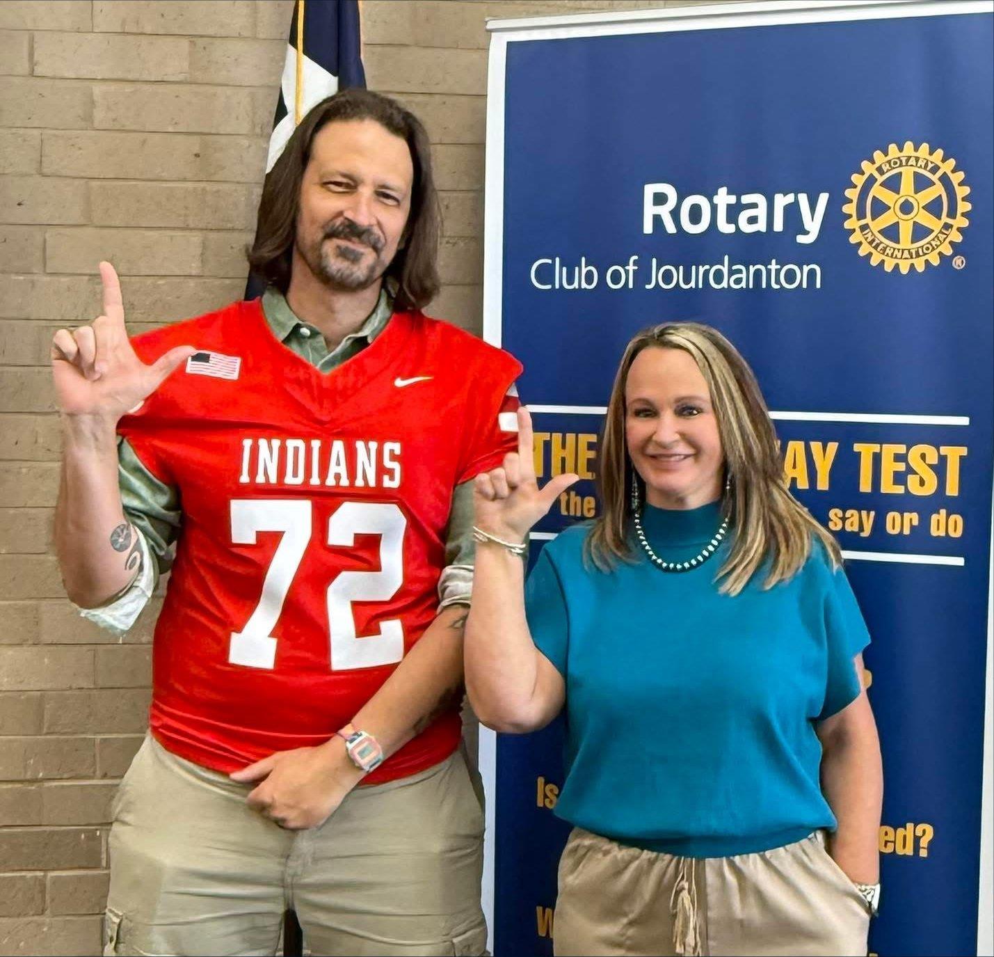 Good Sportsmanship!![]() The Rotary Club Presidents of Jourdanton and Pleasanton competed in the jersey challenge on Friday, September 12th at the Battle of Hwy 97 between their football teams, the Indians and the Eagles. The losing team’s President had to come to the winning team’s Rotary meeting the following week wearing the winning team’s jersey. Examples of great sportsmanship from Jeremy & Shannon and spreading the word how much fun Rotary is!