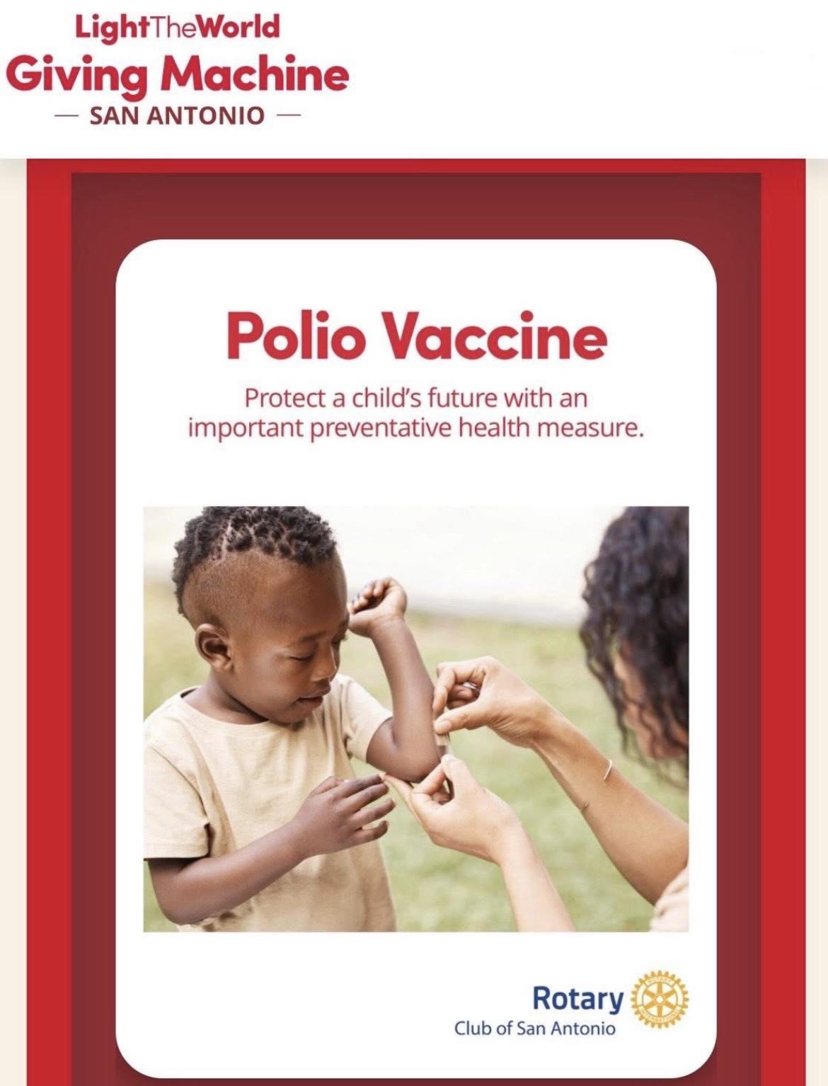 Rotary Lights the World![]() The Rotary Club of San Antonio, TX invites the District to join in their Holiday initiative and polio fundraiser with the Texas Giving Machine from Nov 17th - Dec 7th at Historic Pearl. Join RCSA in their mission of RotaryLightsTheWorld through sponsoring polio vaccines, holiday gifts for children in shelters and hospitals, Kingdom For Kids playground equipment, community cleanup and preservation, and youth scholarships.
