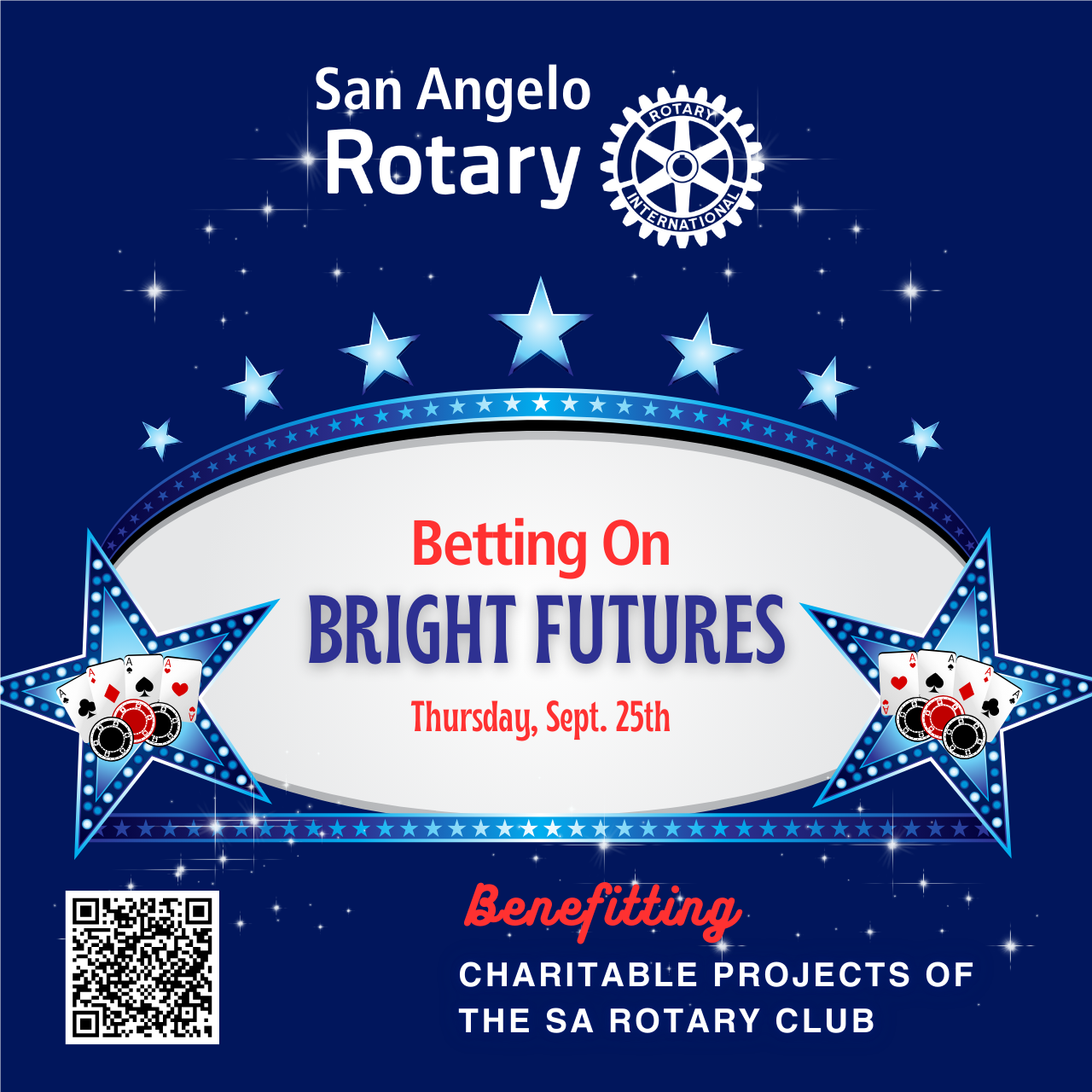 San Angelo Rotary Club Casino Night Fundraiser![]() Join us in San Angelo on Thursday, September 25th for a fun casino night fundraiser benefitting local and international Rotary projects! Tickets are $75 each. Scan the QR code for more information.
