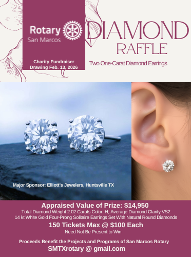 San Marcos Diamond Raffle![]() This is the 3rd annual San Marcos Rotary Diamond Raffle. This year the prize is a pair of one carat natural diamond earrings appraised at $14,950. 150 tickets max are being sold at $100 each.