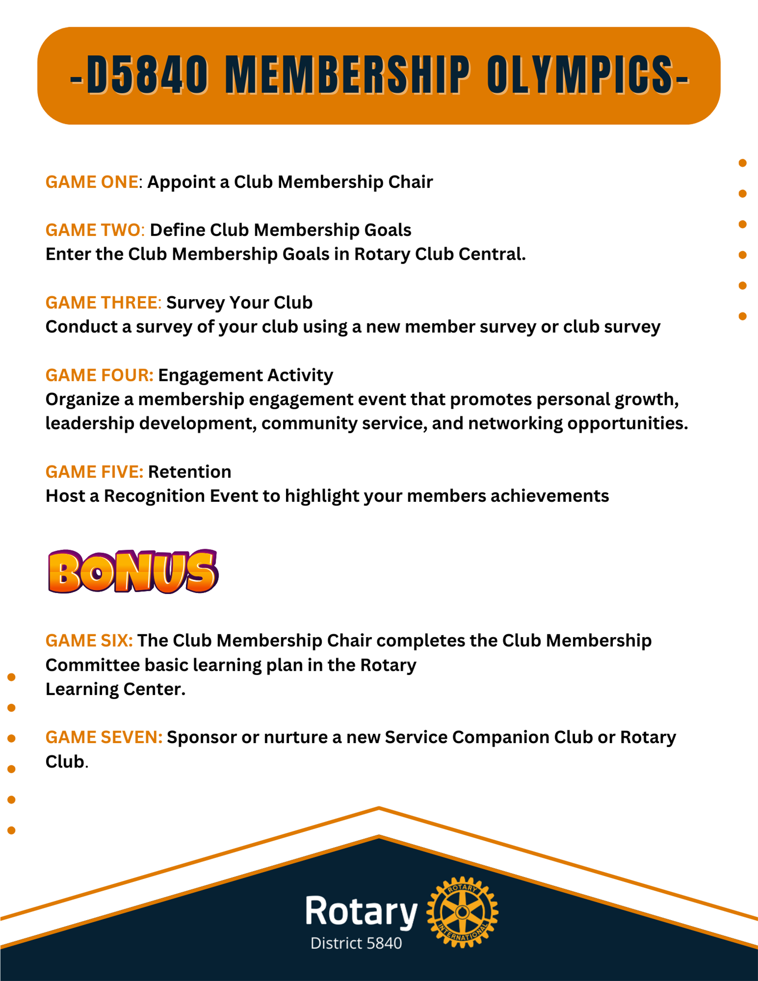 Membership Olympics 2025-2026: Are You Ready to Go for the Gold?![]() The torch is lit, the games are set, and it’s time for District 5840 to make membership growth a celebration! This year, we’re inviting EVERY club in our district to join the Membership Olympics 2025-2026—a fun, friendly competition designed to inspire action, strengthen engagement, and recognize the incredible work of our Rotary clubs. |
